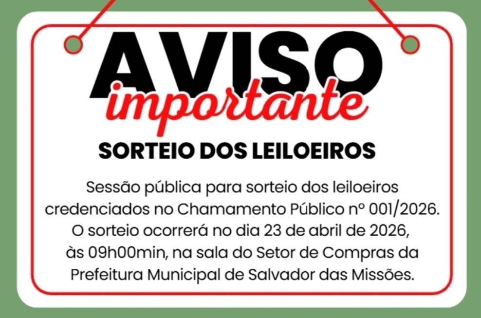O sorteio ocorrerá no dia 23 de abril de 2026, às 09h00min, na sala do Setor de Compras da Prefeitura Municipal de Salvador das Missões. Informa-se que o sorteio será realizado de forma não eletrônica, ocorrendo independentemente da presença dos leiloeiros credenciados, os quais estarão livres para acompanhar todas as etapas do evento, conforme disposto no item 2.5.1 do edital. Ressalta-se que participarão do sorteio exclusivamente os leiloeiros devidamente credenciados e habilitados até a data da publicação deste aviso.