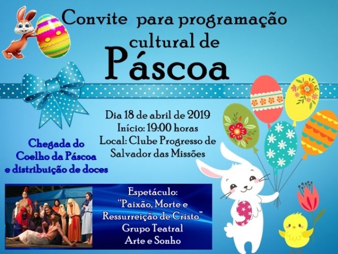 A Secretaria Municipal da Educação, Cultura, Esporte, Lazer e Turismo convida a população para prestigiar o evento da Páscoa que se realizará no dia 18 de abril às 19h no Clube Progresso de Salvador das Missões.