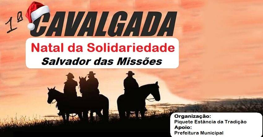 O Piquete Estância da Tradição, com apoio da Administração Municipal de Salvador das Missões, convida para a 1ª CAVALGADA NATAL DA SOLIDARIEDADE, que acontecerá no sábado, dia 11 de dezembro, com abertura oficial às 8h30min, na Praça José Aloísio Nedel.