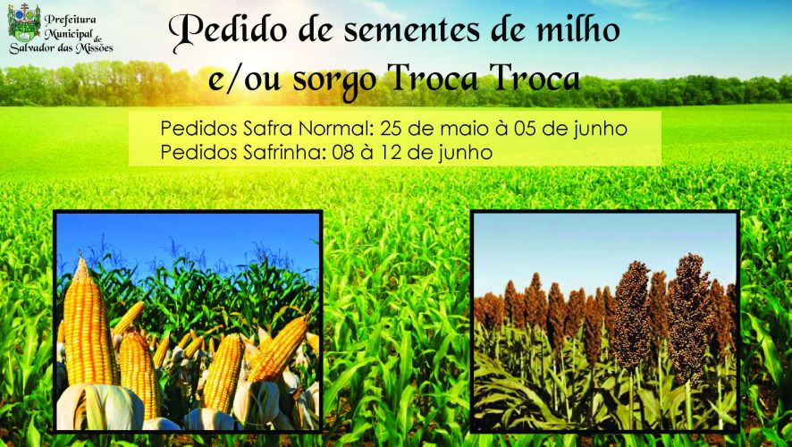 A Secretaria da Agricultura e Meio Ambiente comunica que está aberto os pedidos de sementes de milho e/ou sorgo que poderão ser realizados na própria secretaria, nos seguintes prazos: