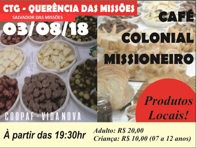 A COOPAF Vida Nova convida seus associados e o povo em geral para seu tradicional café colonial que se realizará neste dia 03 de agosto de 2018 com início às 19h30min no local do CTG Querência das Missões, de Salvador das Missões.