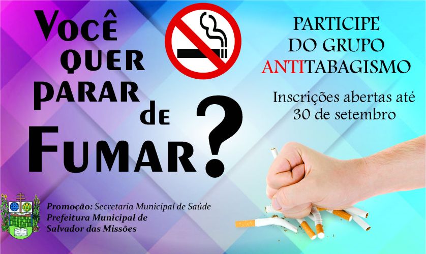 A Secretaria Municipal de Saúde está organizando um grupo ANTITABAGISMO. Chegou a hora de largar o vício. Procure os profissionais da saúde e faça a sua inscrição até 30 de setembro.