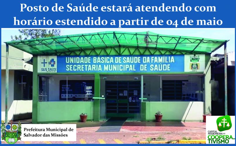 Desta forma, a partir de 04 de Maio de 2020, o Posto de Saúde estará atendendo das 07h00min h às 19h00min h, até 30 de setembro de 2020, ou enquanto durar a situação de calamidade pública em todo território nacional, conforme estabelecido na portaria 430/GM/ MS de 19 de março de 2020.