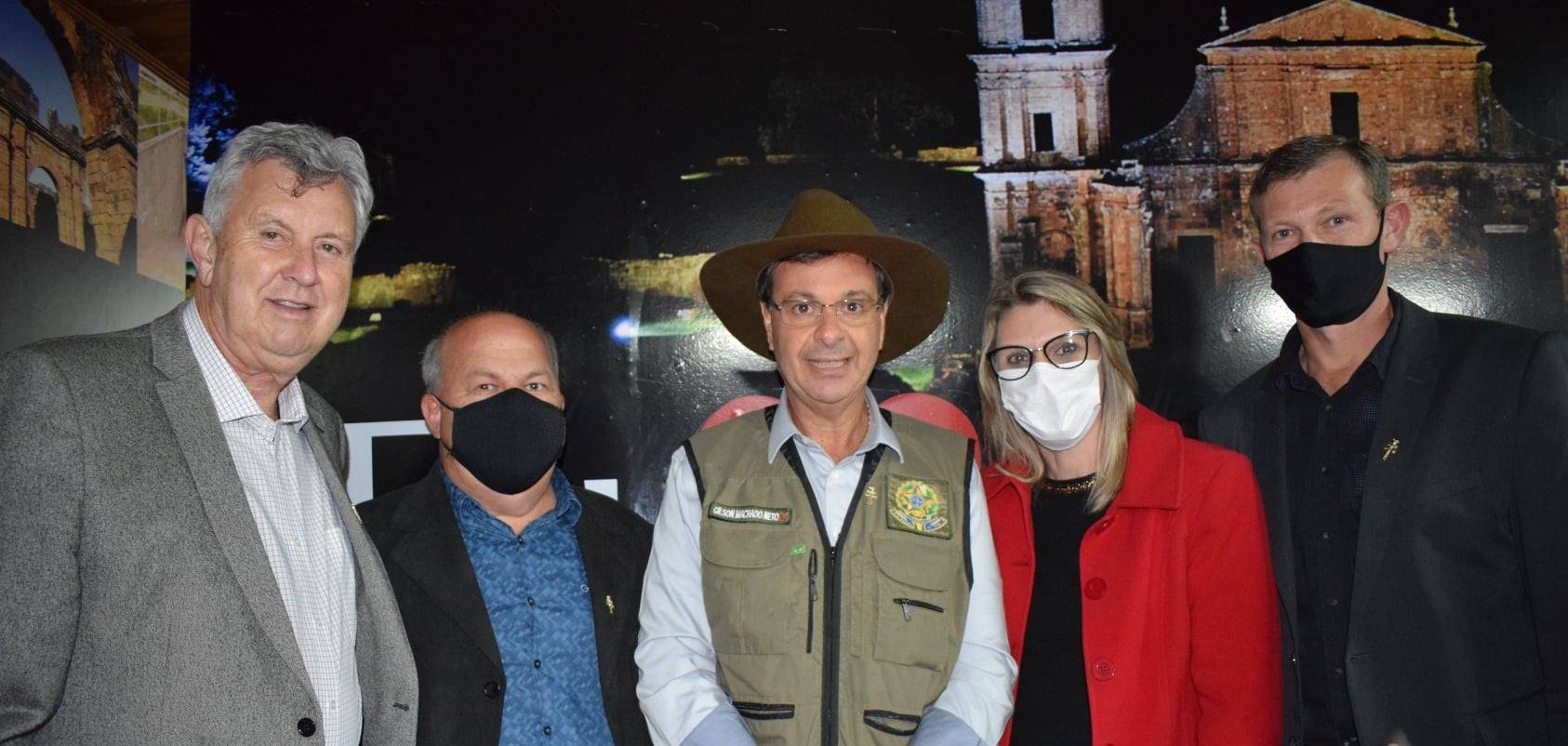 Prefeito Vilson Schons, acompanhado do Vice-prefeito Leomar Henrich e da Secretária de Educação Cheila Spies, participaram neste sábado (14/8), em São Miguel das Missões de importante evento com a presença do Ministro do Turismo Gilson Machado, que cumpriu extensa agenda na Região das Missões com uma comitiva que contou com a presença da Presidente do IPHAN Larissa Machado, Diretora da Embratur Drica de Lucena, Senador Luis Carlos Heinze, Deputados Federais Ubiratan Sanderson, Osmar Terra e Hélio Lopes.