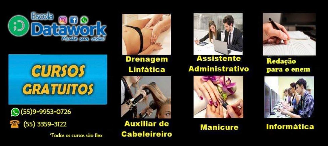 A Rede Datawork de Cerro Largo está divulgando cursos profissionalizantes gratuitos como Drenagem Linfática, Auxiliar de Cabeleireiro, Manicure, Auxiliar Administrativo, Redação para o Enem e Informática. Os cursos são profissionalizantes, com certificados válidos e registrados, podendo ser utilizados em todo território nacional. Esta é uma excelente oportunidade para quem está buscando qualificação profissional.