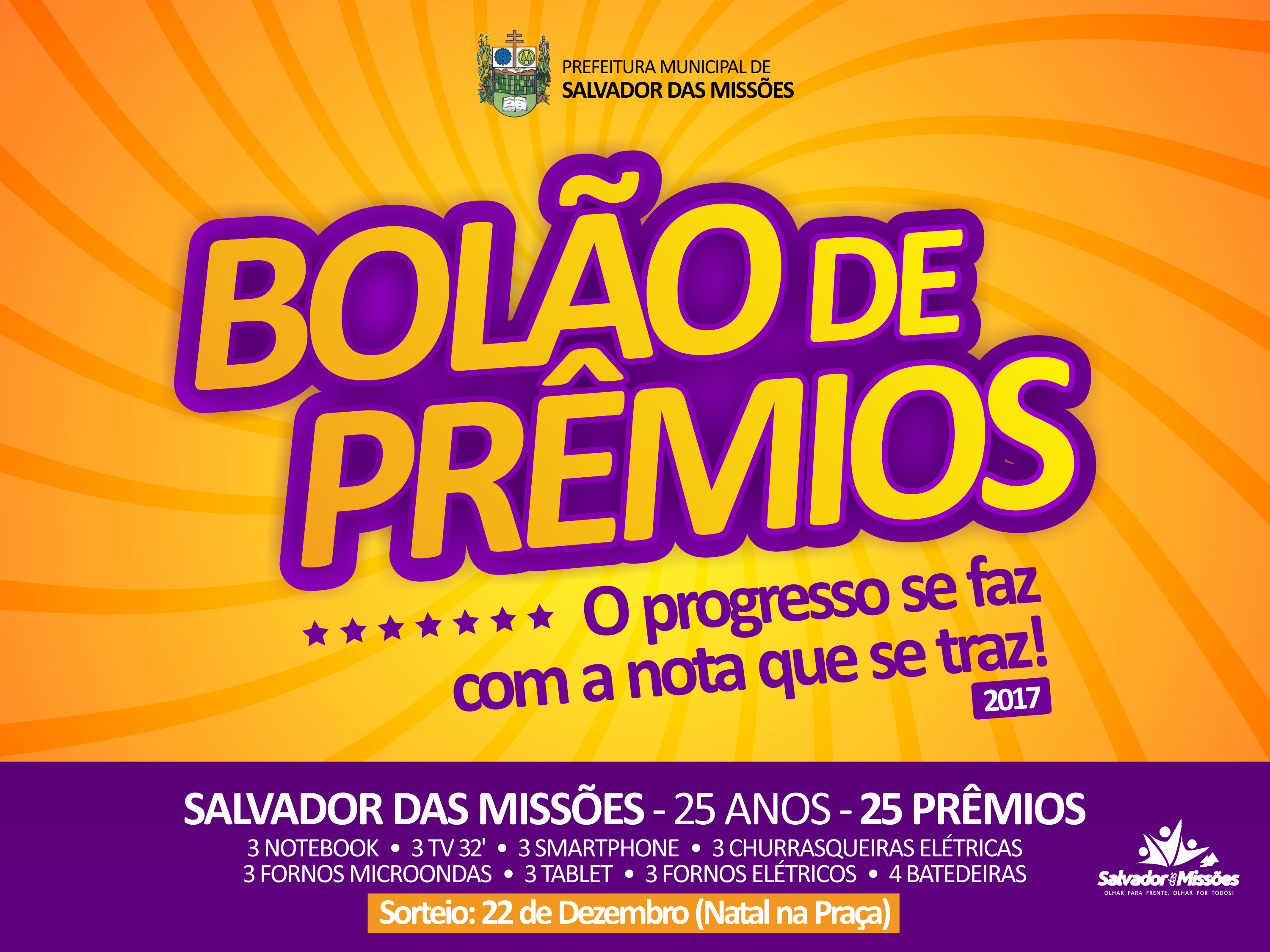 A Administração Municipal de Salvador das Missões lembra de que a campanha do Bolão de Prêmios 2017 - O progresso se faz com a nota que se traz – está chegando ao final. Em alusão ao 25º aniversário do Município, neste ano serão sorteados 25 prêmios. O programa tem por objetivo o combate à sonegação fiscal, através do incentivo à emissão de nota ou cupom fiscal e principalmente de aumentar a valorização do comércio local.