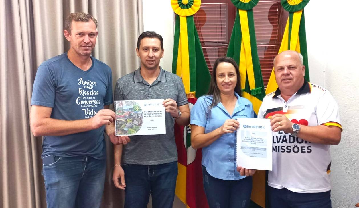 Na manhã da terça-feira, 19 de dezembro, a equipe da Emater de Salvador das Missões realizou a entrega do Relatório de Atividades de 2023 e do Plano Operativo com as atividades a serem desenvolvidas em 2024, ao Prefeito Vilson Schons e ao Vice-prefeito e Secretário da Agricultura Leomar Henrich.