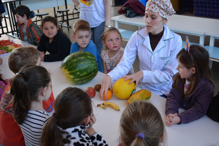 Em seguida, as crianças foram convidadas a experimentar algumas das frutas, entre elas mamão, melão, maçã, banana, kiwi, morango, goiaba e melancia. Essa atividade foi importante por incentivar a experimentar todos os alimentos e assim possibilitar às crianças a descoberta de que podem ter nestes alimentos boa parte das suas refeições diárias.