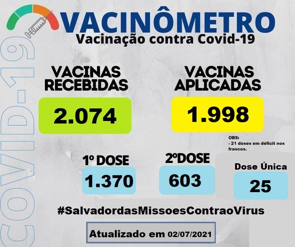 Ao todo já foram recebidas 2.074 doses de vacinas contra a Covid-19, dessas 55 doses aguardando a data de aplicação da 2ª dose no dia 05/07/2021. Nesta semana sendo imunizados a faixa etária de 55 anos.