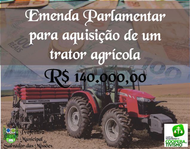 Esse valor será destinado para aquisição de um trator agrícola, novo, tração 4X4, com potência superior a 100CV, com cabine e ar condicionado. Esse trator já foi licitado e totalizou no valor de R$198.230,00 sendo que R$58.230,00 é contra partida do município. A marca vencedora da licitação foi Massey Ferguson.