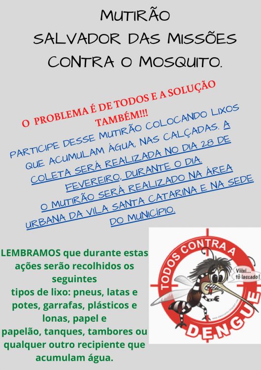 No dia 28 de fevereiro, durante o dia, o Mutirão será realizado na área urbana da Vila Santa Catarina e na sede do município.