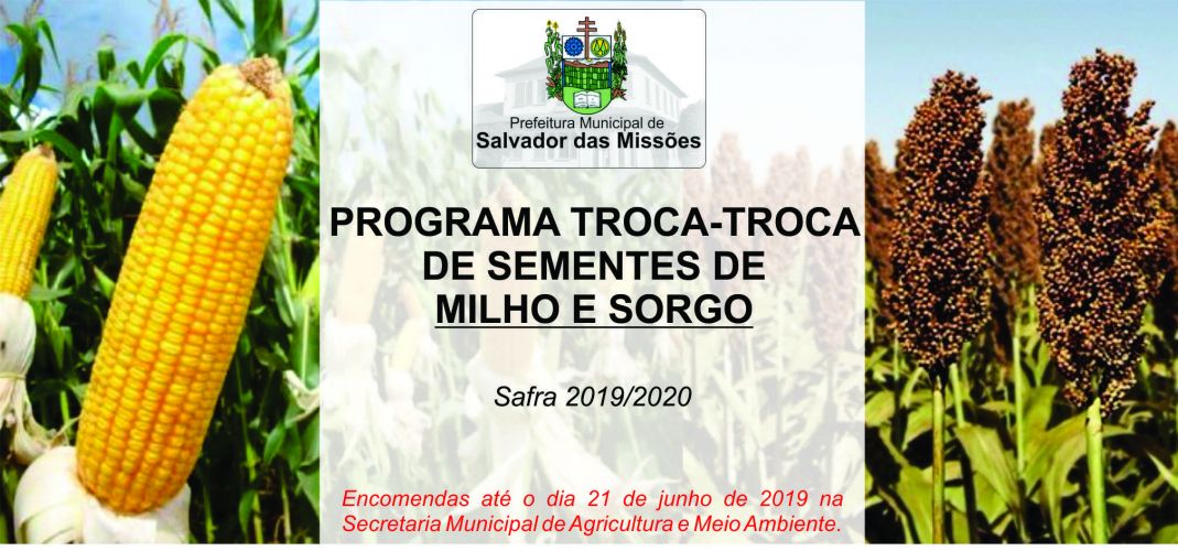 Estão abertas as encomendas de semente de milho e sorgo safra 2019/2020. Pedidos até o dia 21 de junho de 2019 na Secretaria Municipal de Agricultura e Meio Ambiente.