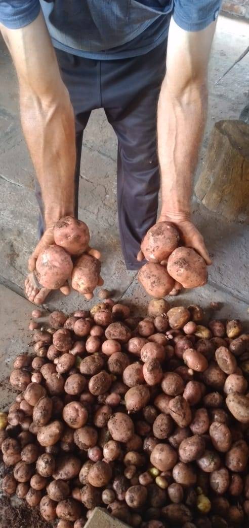 Na propriedade de João e Rosana Dillenburg, na Linha São José, a colheita da batatinha está em andamento e apenas dos 25 kg da Variedade Rosa-Maçã plantados já foram colhidos 225 kg.