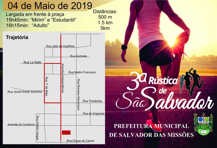A Secretaria Municipal da Educação, Cultura, Esporte, Lazer e Turismo está realizando mais um projeto da 3ª Rústica de São Salvador. O evento será dia 04 de maio de 2019, sábado, na praça central de Salvador das Missões.