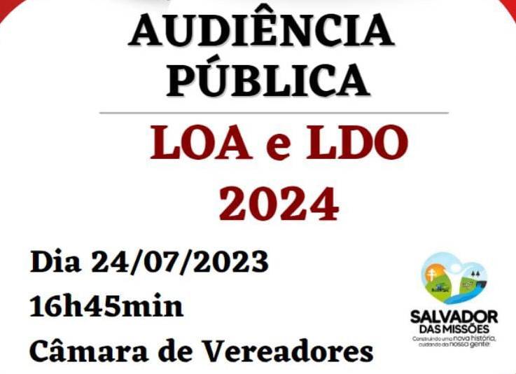 O Prefeito de Salvador das Missões, VILSON JOSÉ SCHONS, no uso de suas atribuições legais e constitucionais, em atendimento ao § único, do artigo 48, da Lei Complementar 101/2000, TORNA PÚBLICO para conhecimento de todos que realizará AUDIÊNCIA PÚBLICA para apresentação e consulta pública do projeto de Lei de Diretrizes Orçamentárias e Lei Orçamentária Anual para o ano de 2024, INFORMANDO a população que a Audiência Pública para apresentação realizar-se-á no dia 24 de julho de 2023, às 16 horas e 45 minutos, no Plenário da Câmara de Vereadores de Salvador das Missões.