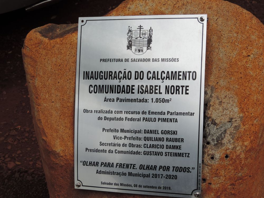 A Prefeitura Municipal de Salvador das Missões inaugurou no domingo (08/09) a pavimentação em calçamento da estrada em frente ao Clube Social São Jorge da Linha Isabel Norte. Ao todo foram construídos 1.050m² de calçamentos, obra oriunda de recursos de Emenda Parlamentar do Deputado Federal Paulo Pimenta (PT), com contrapartida da Prefeitura na confecção de cordões, terraplanagem e rolagem.