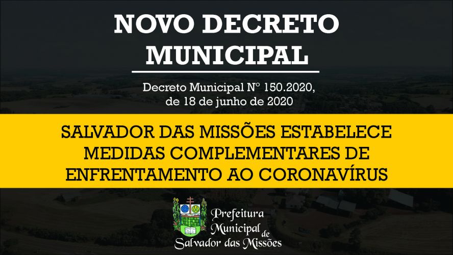 Tendo em vista a discussão sobre o sistema de bandeiras pelo Governo do Estado/RS, no enfrentamento à pandemia, na assembleia geral virtual extraordinária da AMM – Associação dos Munícipios das Missões na data de 17 de junho de 2020, Salvador das Missões estabelece medidas complementares de enfrentamento ao coronavírus.