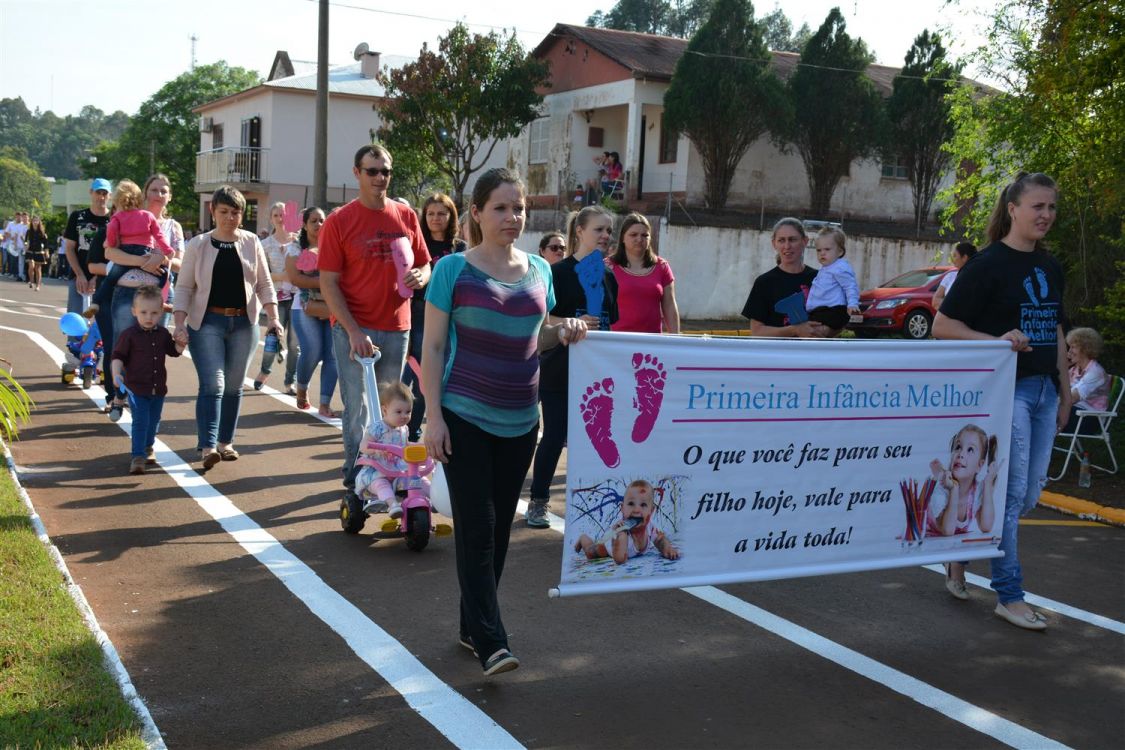 Após as soberanas, o grupo do PIM, Programa Primeira Infância Melhor, veio representado pelas crianças, pais e monitores. Atualmente o PIM atende 11 gestantes, 97 crianças de 0 a 3 anos e 9 crianças de 4 e 5 anos.