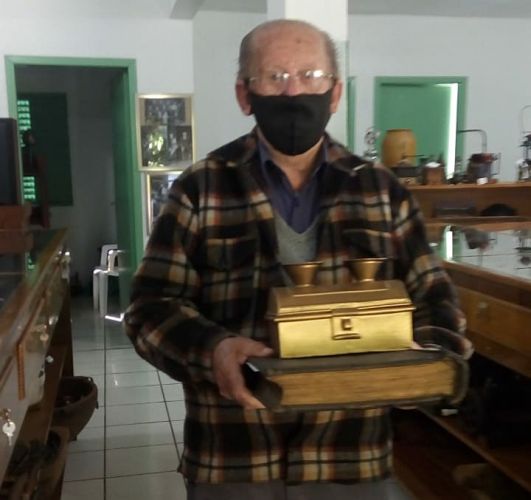 Apesar de não iniciar uma campanha de doações, os moradores do município tem procurado entregar seus objetos guardados com todo zelo, por longos anos. Nesta semana, recebemos a doação do senhor Harry Lenz de um livro caixa de 1929, que pertenceu a casa de comércio de José Aloysio Nedel e também uma urna de votos para a aceitação de novos sócios, que pertenceu ao clube Progresso, provavelmente em 1954.