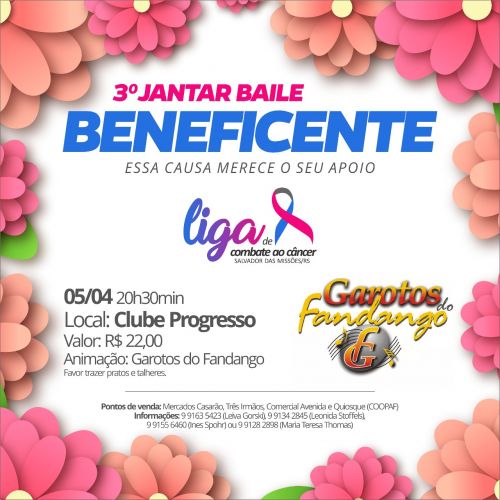 A Liga de Combate ao Câncer de Salvador das Missões está promovendo o evento do 3º Jantar Baile que será no dia 05 de abril no Clube Progresso com animação da banda Garotos do Fandango.