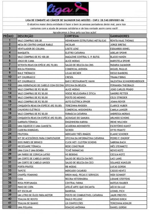 A Liga de Combate ao Câncer fica honrada pela presença da comunidade Salvadorense, bem como a de comunidades vizinhas e também, em especial, com a presença da Prefeita Noila e seu esposo Juca de São Paulo das Missões e do Prefeito Auri e a Primeira Dama Carmem de Pirapó e suas comitivas.