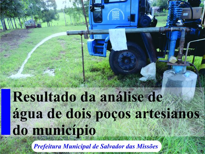 No dia 15 de julho, segunda-feira, a Prefeitura Municipal de Salvador das Missões recebeu da Geóloga Isabel da Corsan Porto Alegre, a boa notícia do resultado das análises de água desses dois poços, os quais apresentaram resultados satisfatórios de acordo com a expectativa da Administração Municipal e da comunidade, possu água potável para o consumo humano e animal.